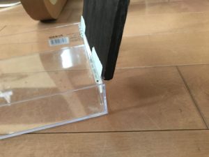まず、板を透明プラケースよりちょっと長いくらいのながさ(1.5~2 cm)に切ります。