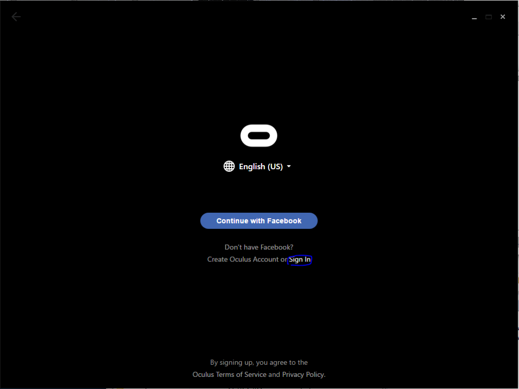 FaceBookアカウントかOculusアカウントでサインインする画面で sign in を押す。